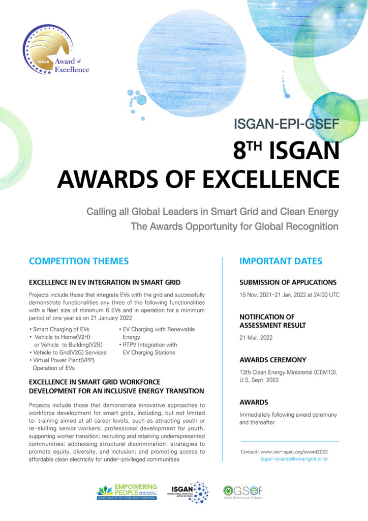 Nominations are now open for the 8th ISGAN Awards of Excellence, sponsored by the International Smart Grid Action Network (ISGAN), in partnership with the Global Smart Energy Federation (GSEF) and the CEM Empowering People Initiative (EPI). The awards will recognize excellence in innovation, integration, and transformation of smart grid systems and policy.